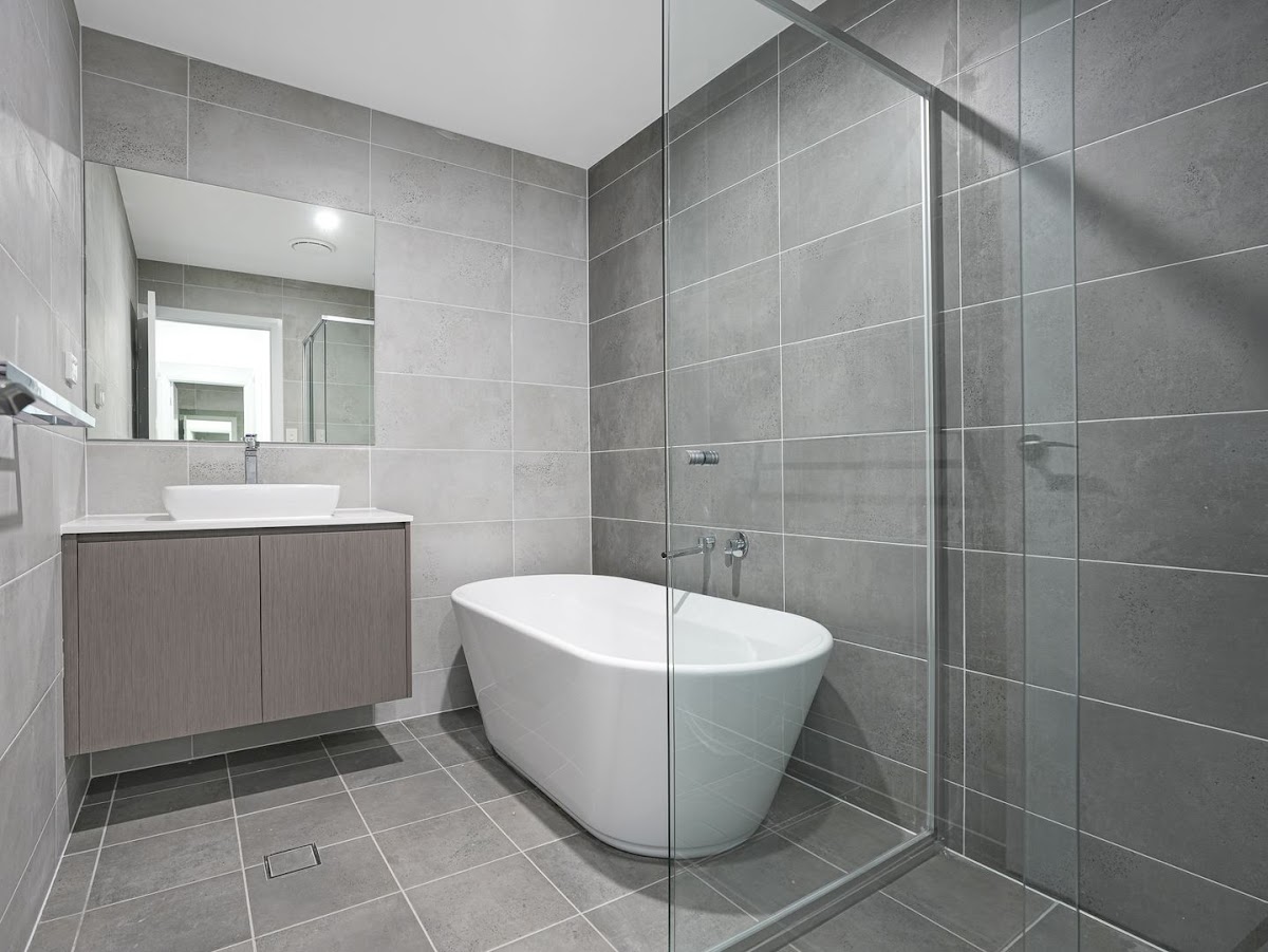 • Modern main bathroom featuring stylish floor-to-ceiling tiles