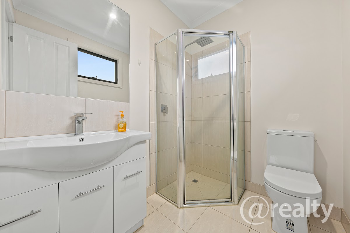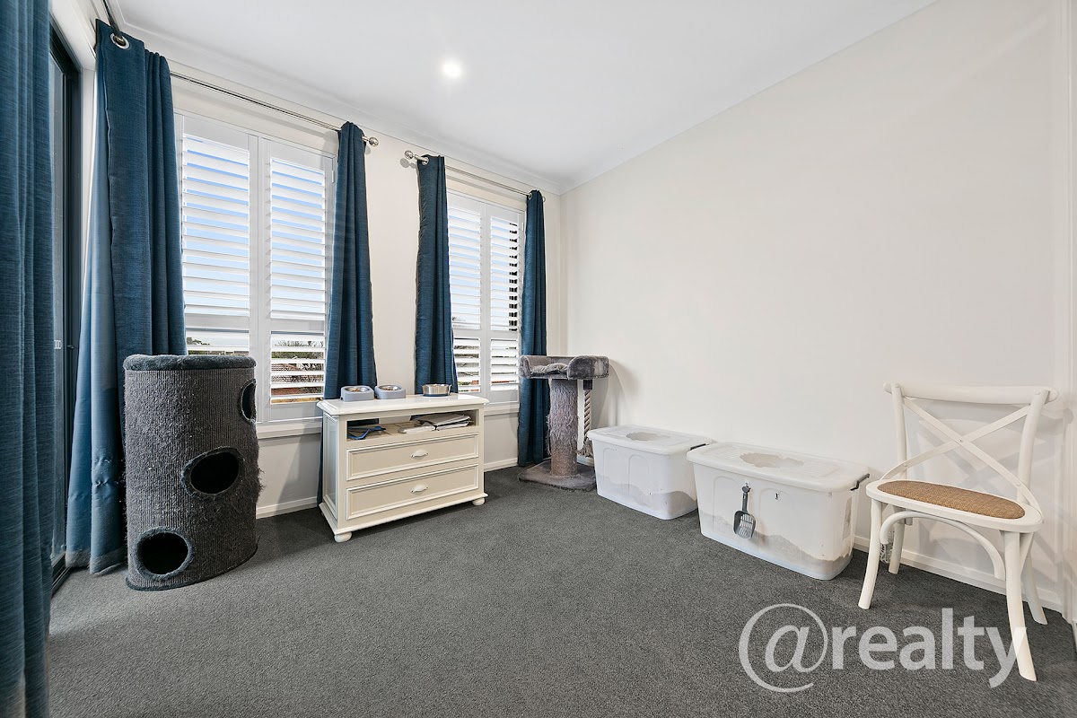 The upper floor is dedicated to the home’s private quarters, featuring three bedrooms, all equipped with built-in robes. The master bedroom boasts a full ensuite and shares access to a balcony with one of the other bedrooms, providing a serene spot for morning coffee or evening relaxation. The upper floor also includes a main bathroom and a second toilet, ensuring ample facilities for the household.