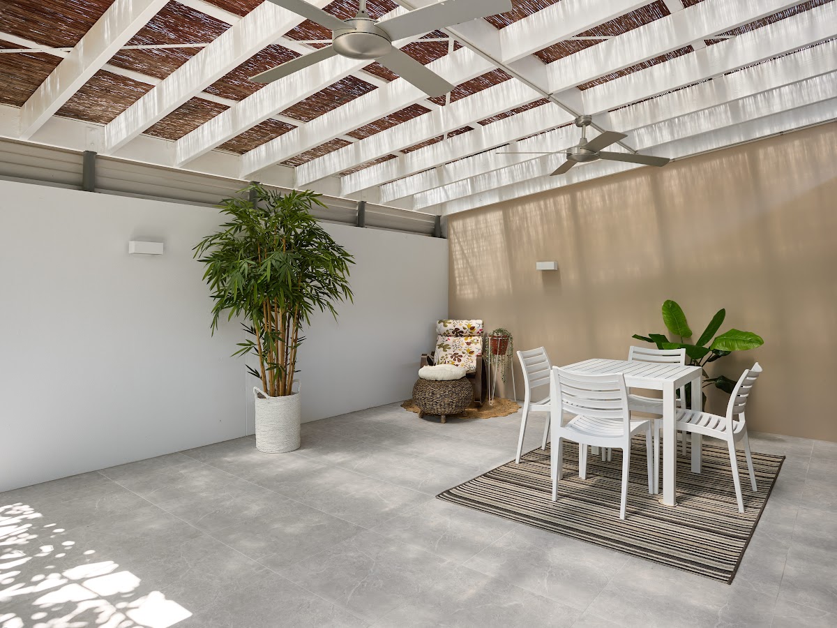 • Upgraded patio with new light grey porcelain tiles and tinted polycarbonate roofing