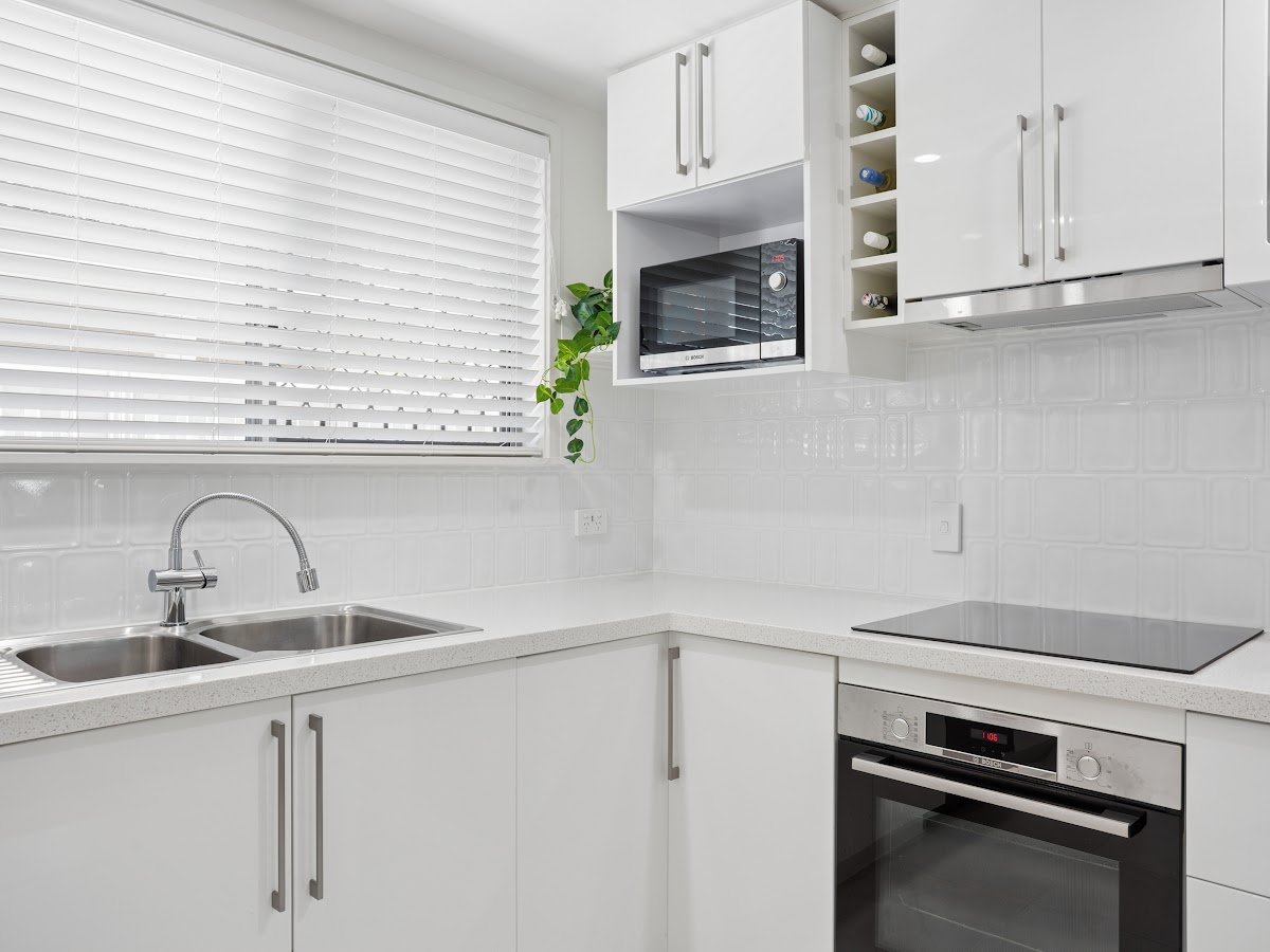 • Feature white textured splashbacks in kitchen and laundry