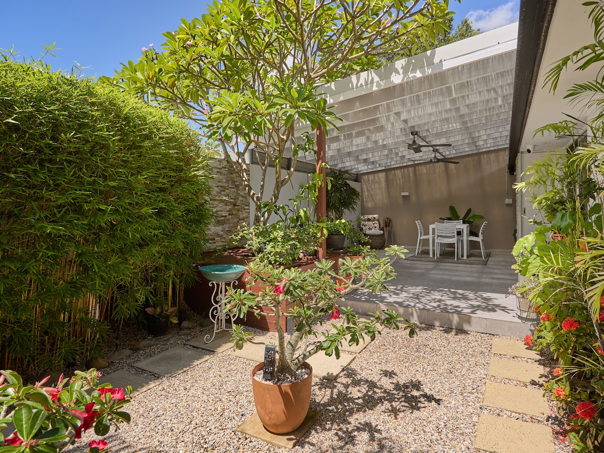 • Stone feature elements, including a striking stone wall surrounding the frangipani tree