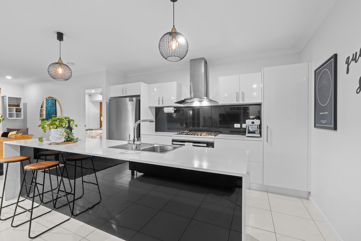 – Expansive galley kitchen showcases a generous island with ambient pendant lighting and stone benchtops offering ample room for barstools, built-in microwave box, dishwasher, multiple soft-closing drawers, cupboards and pantry, 90cm gas cooktop and under-bench oven beneath a stylish canopy rangehood, space for a large fridge, room for a coffee station, well-thought-out with plenty of powerpoints