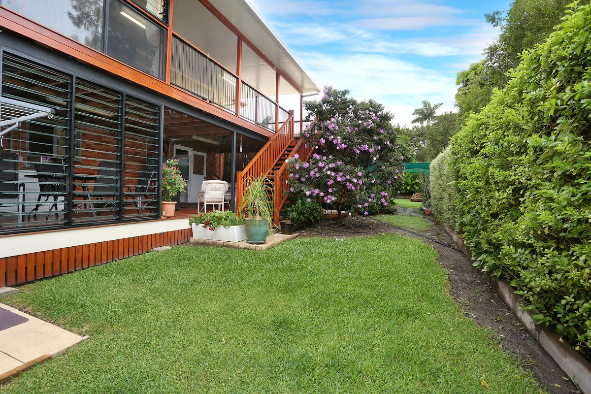 Currently one end of the upstairs deck has brand new louvers and windows, and ‘crimsafe’ screens so it can be opened up to allow the breeze in, or closed up in the cooler weather – this end it is currently used as a TV viewing area; then it flows into a dining area for breakfast, and further along a separate lounge area at the other end – all overlooking the back yard, and catching the breezes.