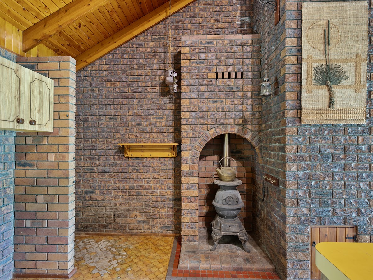 The home itself was built in the 1980s and remains true to its era, offering original charm and character that simply cannot be replicated today. Constructed with a level of building integrity and craftsmanship rarely seen in modern homes, it reflects a time when quality materials and solid construction were prioritised. From the moment you step inside, you are greeted by exposed brick interiors, timber-lined ceilings and beautiful brick archways flowing through the living, kitchen and dining spaces. The living room is centred around an open fireplace, creating a warm and inviting heart of the home during winter, while the kitchen features a rustic cast iron slow combustion wood stove that adds to the home’s country appeal. The generous U shaped kitchen offers ample bench space and storage, proving that size and functionality were never compromised.