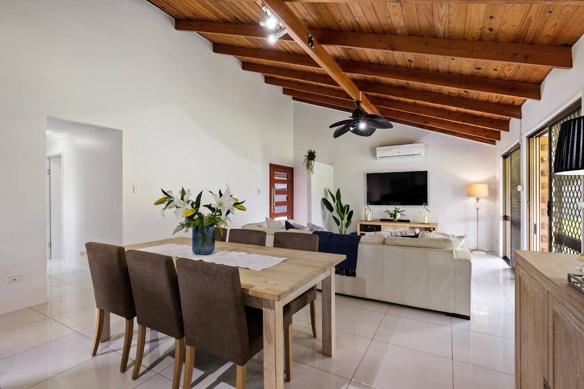 Step through the front door and discover a spacious, open-plan design that’s perfect for entertaining or simply enjoying everyday life. The living area, bathed in natural light, features striking timber raked ceilings that add character and charm. Relax in air-conditioned comfort while taking in views of your expansive backyard through large, inviting windows.