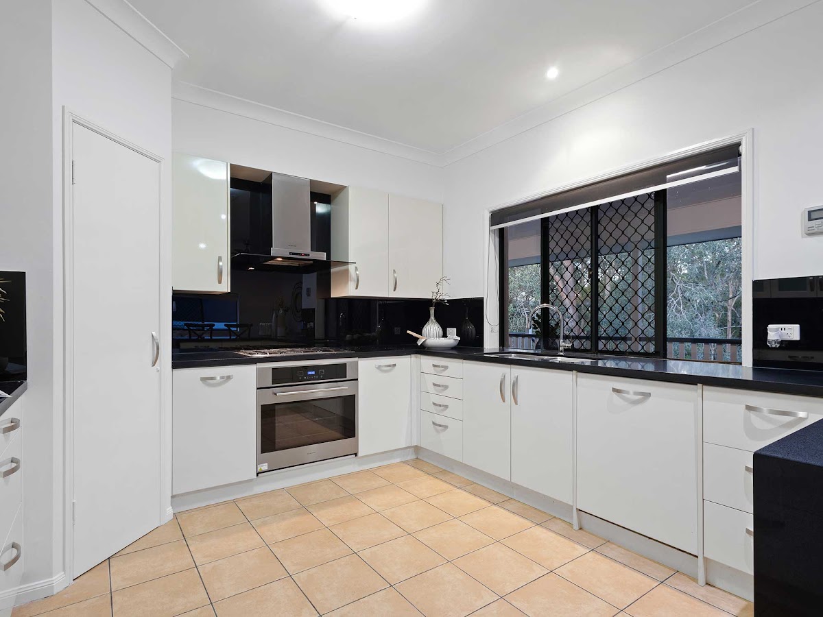 Colourful hedges line a path to the front door and into the fully air-conditioned upper level, which offers 4 large living spaces, 4 bedrooms, 2 bathrooms, and double garage, all under soaring 9ft (2.7m) ceilings. Double doors lead from the garage into the huge open plan family and dining areas, which make moving sizeable furniture into the home a breeze. Remote-controlled translucent and block-out twin-blinds allow you to control the amount of natural light into these areas, and a skylight ensures a light filled kitchen throughout the day. The stylish kitchen boasts quality Kleenmaid appliances (750mm oven and cooktop with 5 burners complemented by a 900mm glass canopy rangehood) and an integrated Bosch dishwasher. Gleaming black glass splashbacks and stone benchtops (with a waterfall edge and breakfast bar), complement banks of storage cupboards, drawers and a deep corner pantry. There’s room to prepare meals for the largest family or gathering, whilst being central to all living areas and overlooking the deck and adjoining parkland. Relax on the enormous 12m long deck and enjoy the cool north-easterly breeze and abundant birdlife, as you overlook the tree-studded parkland and nearby state forest.