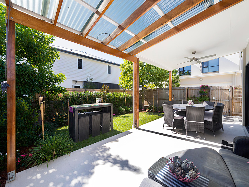 5. Covered outdoor entertaining area overlooking a manicured garden with plenty of grass for