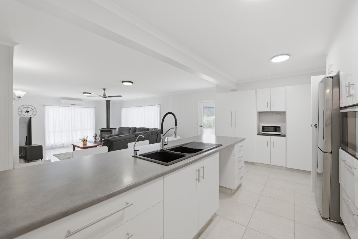 The accommodation is equally impressive, with the main bedroom positioned for extra privacy, complete with a walk-in robe and en-suite finished in clean, modern tones. Three additional bedrooms, each fitted with robes and ceiling fans, line a quiet hallway, paired with a refreshed bathroom and separate WC. Heating and cooling are covered through a wood fire, gas heating and a split system unit, while a large storeroom/workshop and an oversized laundry add welcome storage and direct access to the garden.