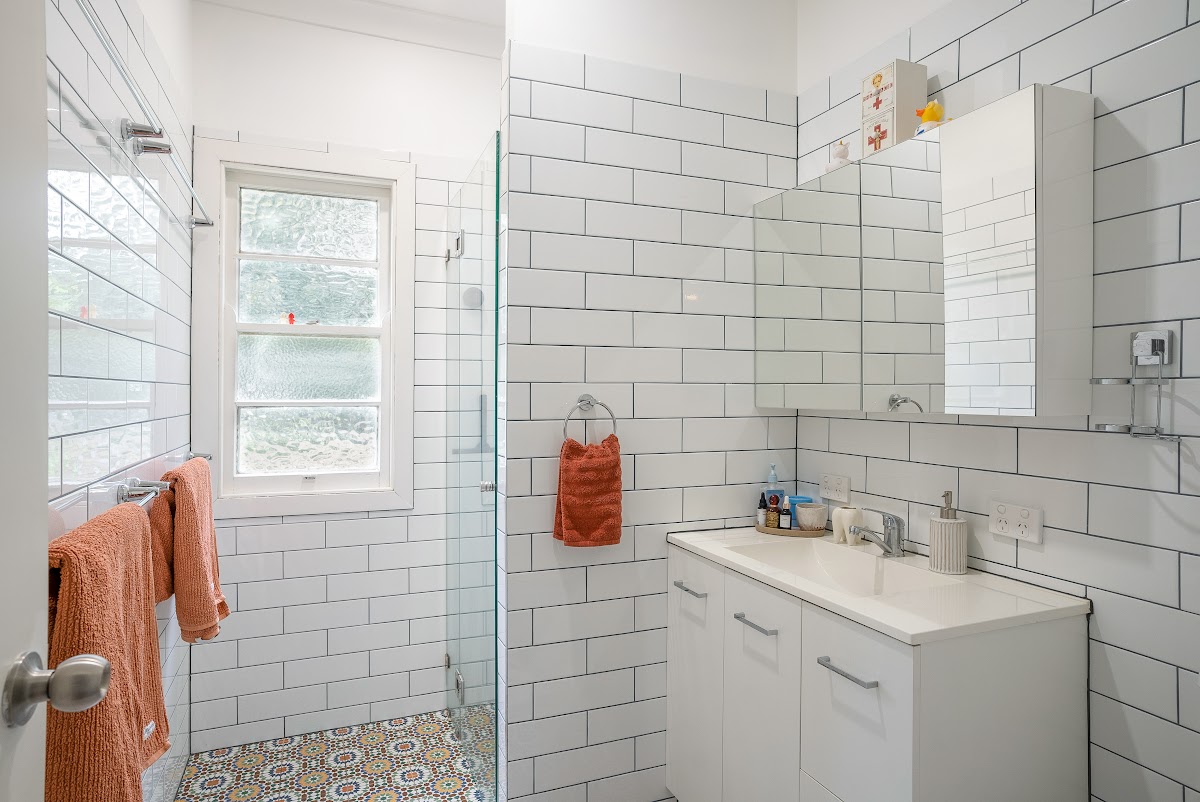 Stylish and modern, the bathroom showcases Moroccan style floor tiles, and is both delightfully eye-catching and light-filled.