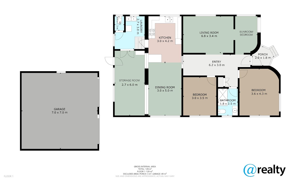 The home boasts two generously sized bedrooms, a sun room / 3rd bedroom, family bathroom, central living area, kitchen and dining area and an enclosed laundry with 2nd toilet and storage room.