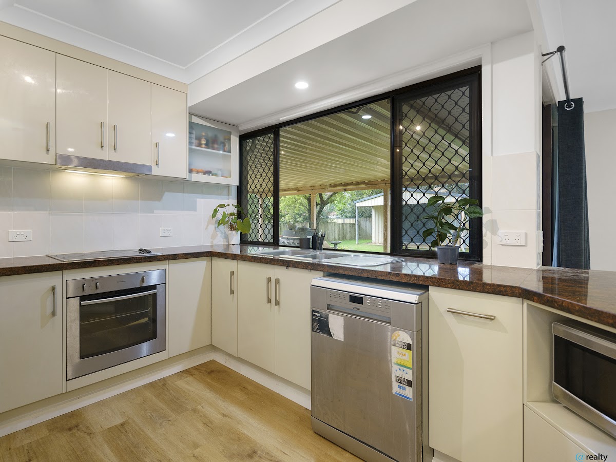 The well-appointed kitchen features beautiful red granite bench tops, as well as a dishwasher.