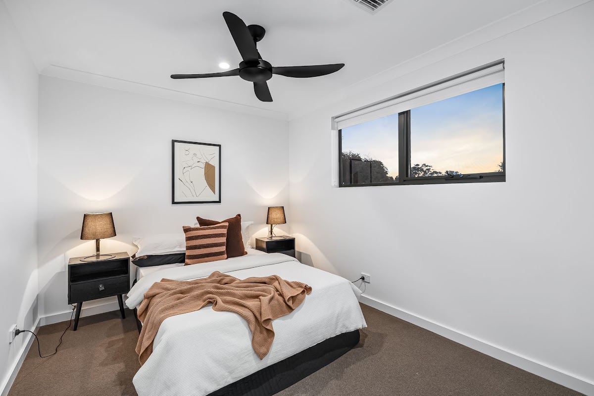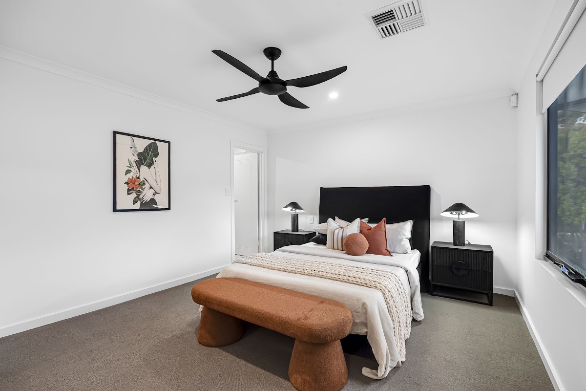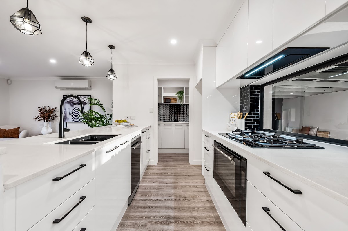 As you enter, the open plan lounge, breakfast bar and kitchen are to your left. The lounge is bathed in natural light and the ultra-modern kitchen is simply stunning. Boasting expansive stone-top work spaces, 2-pac soft-close joinery, 900m electric oven and 5 burner gas cook top and dishwasher, beautifully finished with trendy splashback and feature lighting. The butler’s pantry with lots of cupboard space and sink is a wonderful added bonus.