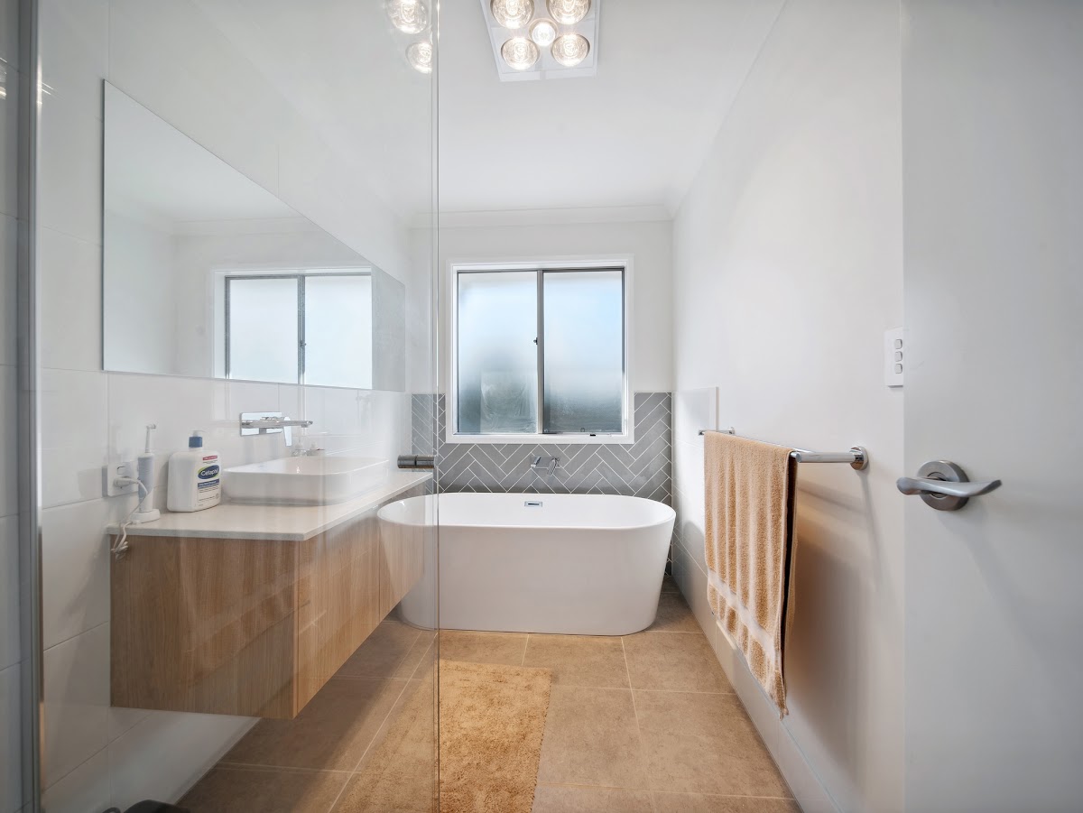 – Ensuite with double vanity with featured subway tiles, floating cabinet, shower screen and freestanding bath