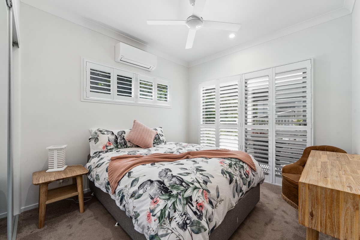• Additional Bedroom: The second bedroom provides comfort with direct access to the alfresco area and nearby second bathroom and complete with plantation shutters, a built-in robe, air-conditioning, and ceiling fan—ideal for family or guests.