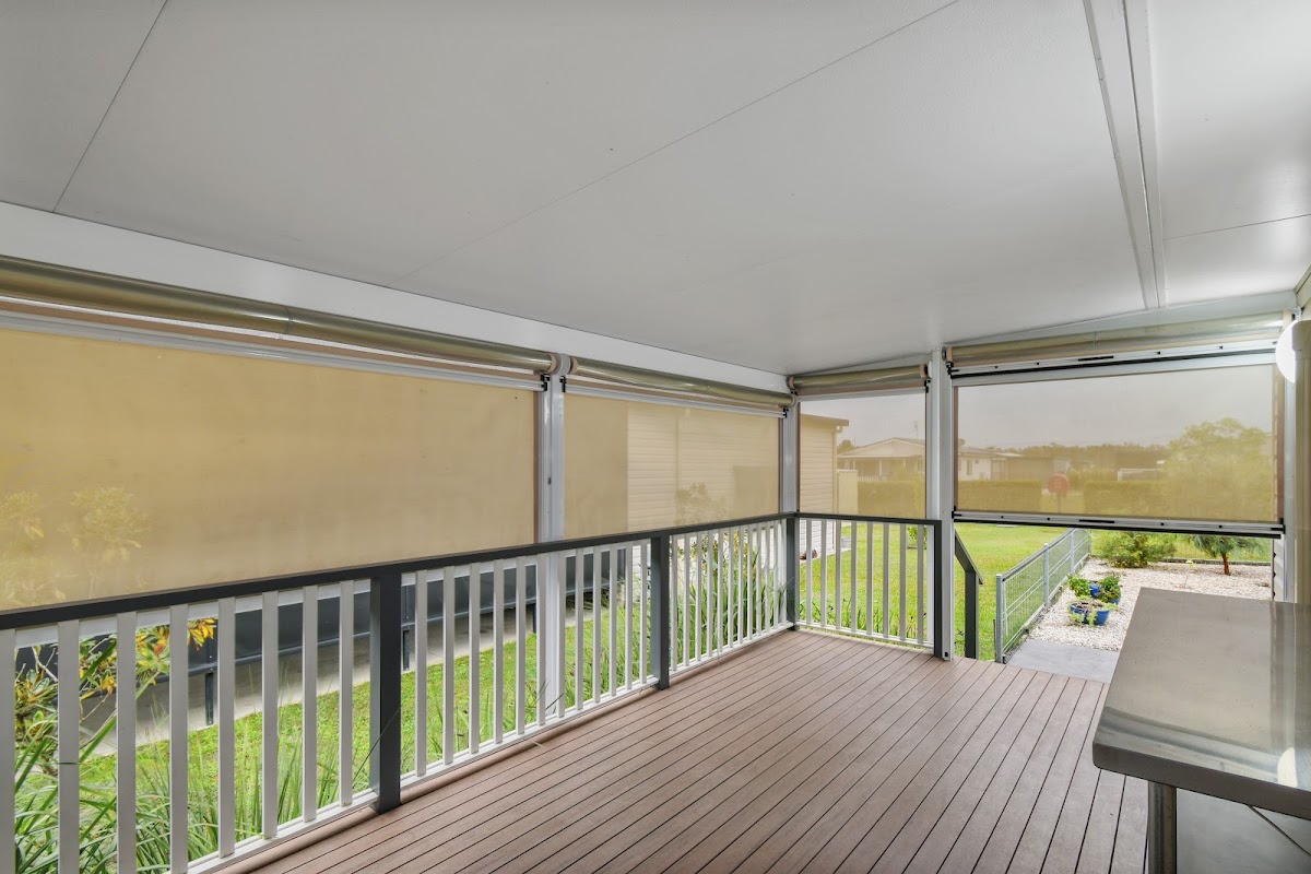 + The large fully enclosed deck area is a feature and approx. 5.6 x 3.5 metres and is protected by clear rain proof protection and also shade cloth which is adjustable.