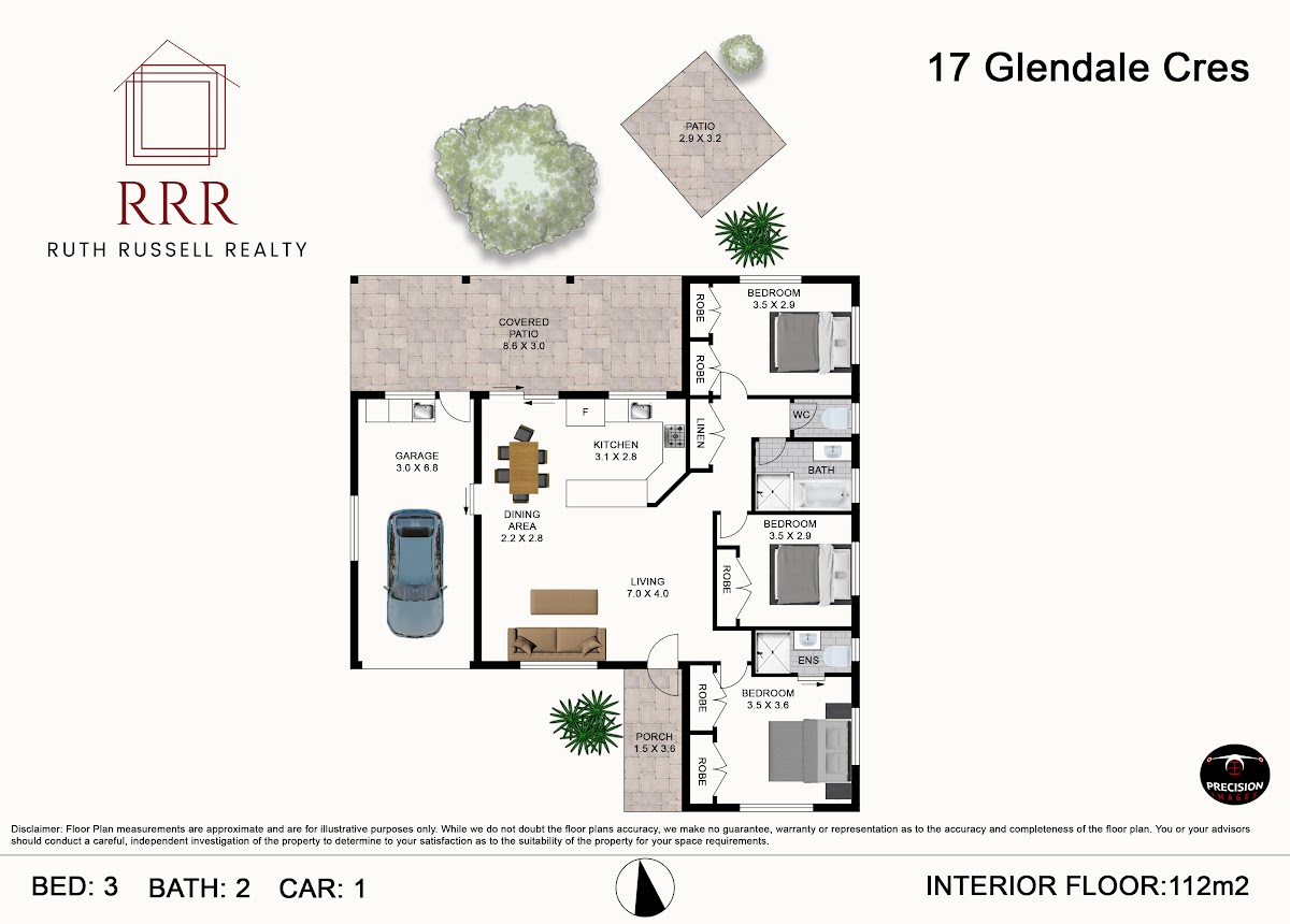 Three bedrooms, all with built-ins and garden views. The primary bedroom comes with an ensuite, whilst the other two bedrooms share the main bathroom.