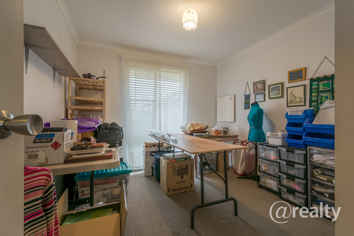Past the lounge there is plenty of space for a dining room table and chairs. The corner of the room is ideal for a study or computer nook, whatever your needs. From here there’s a glass sliding door opening out to a good size sunroom and a large storage room where you can keep all your extras that you just cannot bear to part with but don’t need on a daily basis.
