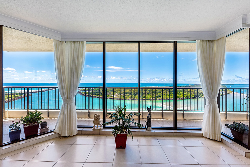 This apartment is situated in a prime spot, offering specular views of the ocean, Jack Evan Boat Harbour, Tweed River or out to the Hinterlands.