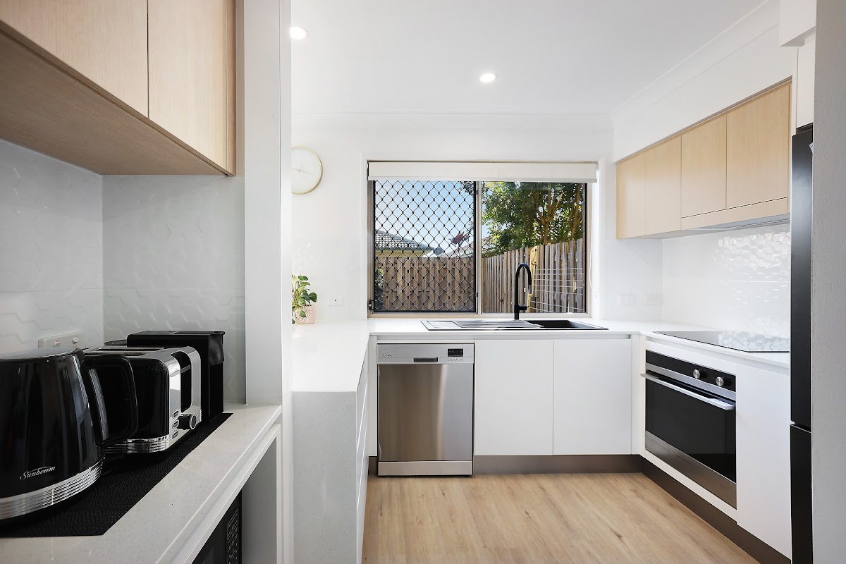 The completely new kitchen offers extra cupboard space, soft close cabinetry, new appliances, a breakfast bar and stylish backsplash.