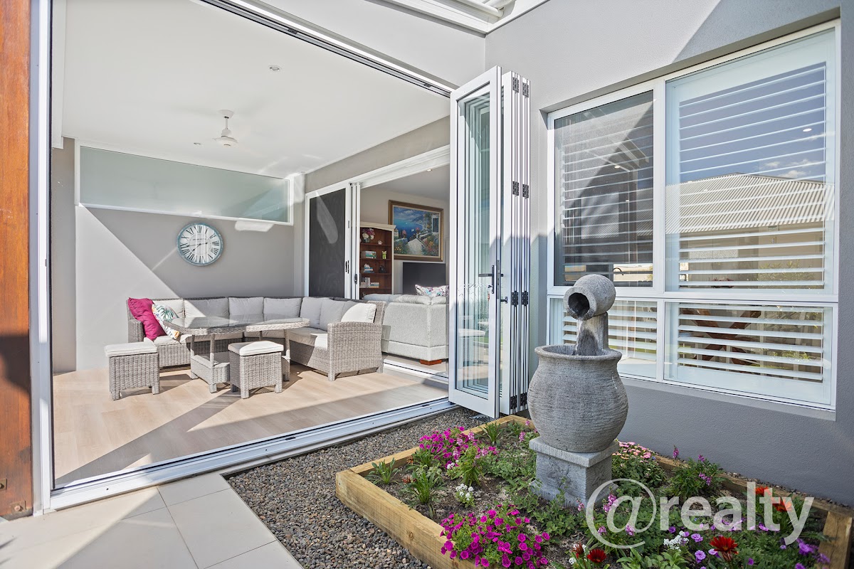 Upon entry, you’re welcomed by sunlit interiors accentuated by expansive bi-fold doors that invite natural light to dance throughout the space. Step outside to uncover an inviting entertainment area bordered by tranquil water features and meticulously landscaped gardens—a perfect setting for al fresco dining or moments of serene contemplation.