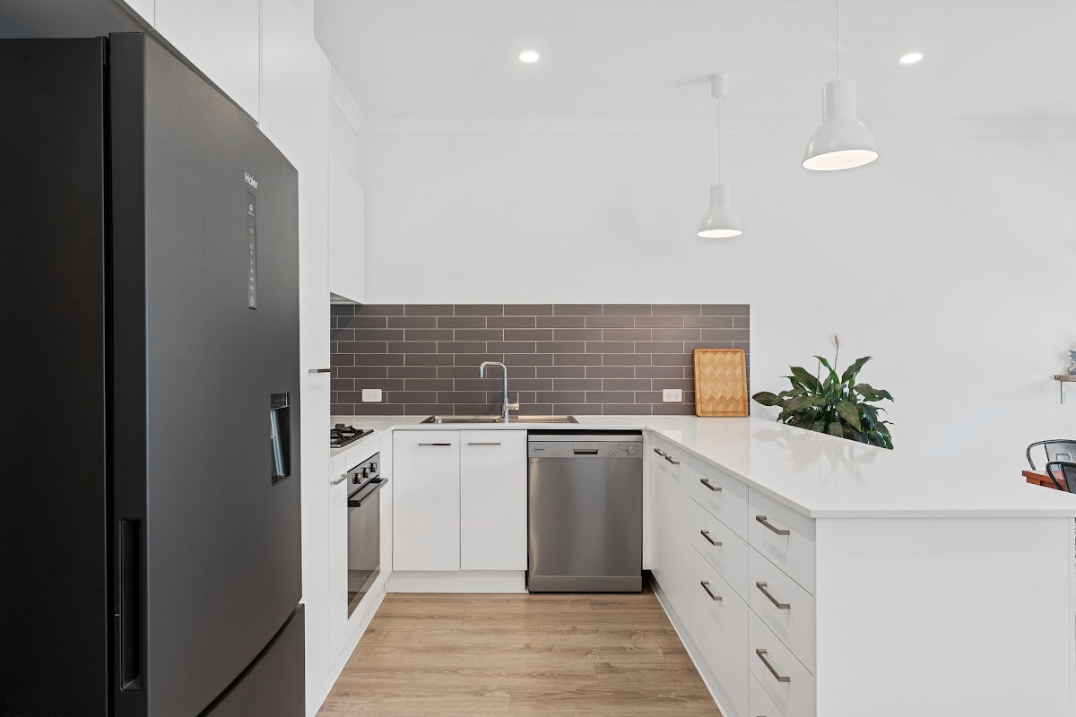 A light-filled living and dining area on the top level connects with a private, garden-framed courtyard, creating a relaxed setting for downtime or entertaining. A fully equipped kitchen crowns this hub, boasting Westinghouse stainless steel appliances, tiled splashbacks and stone countertops that extend to a breakfast bar.