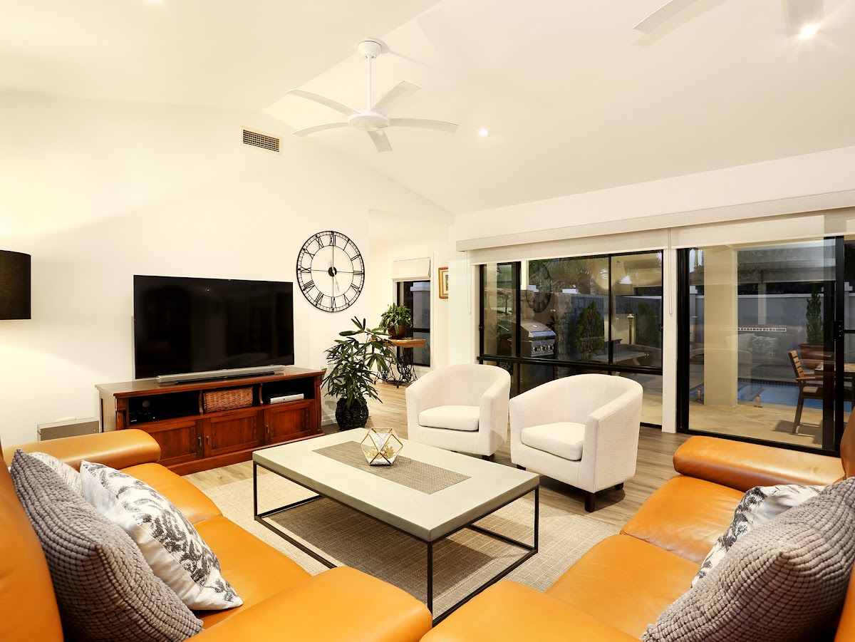 A generous master bedroom with en-suite has a fantastic view through sliding glass doors. The view extends into the lanai and beyond to the alfresco area. Sandstone tiles surround the magnesium pool. Here you can entertain in all weathers as the roof has been extended to provide a seamless roofline; the ultimate all weather entertaining area.
