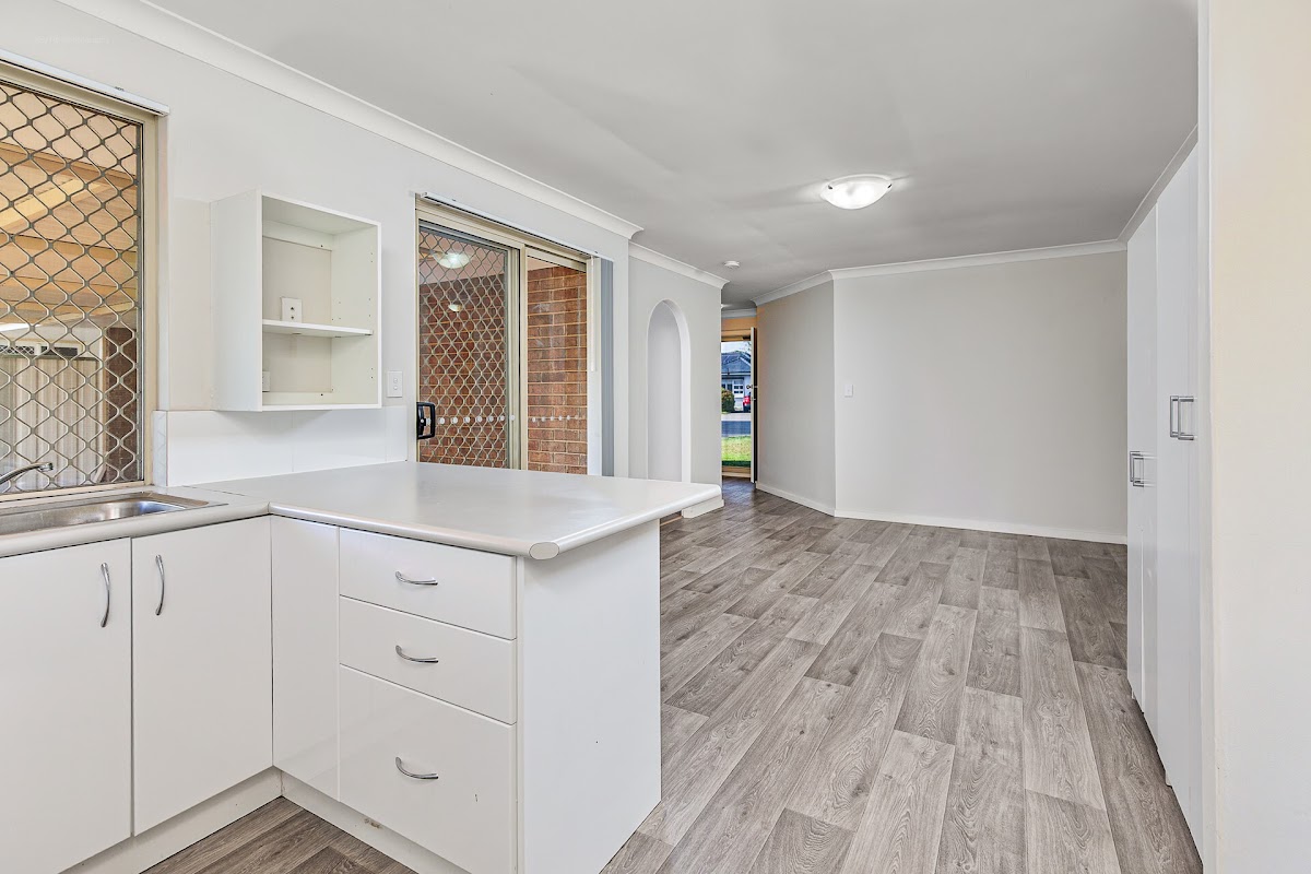 The home features two distinct living areas: a cosy front lounge with split system air conditioning, gas points, and high ceilings that add a sense of space and comfort. The open-plan kitchen and dining area brings in natural light and flows directly out to the covered patio. The kitchen is well laid out with a breakfast bar and plenty of storage for everyday essentials.