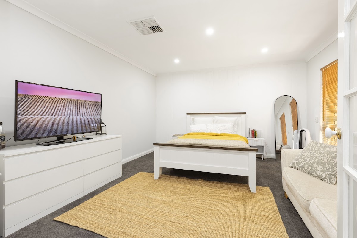 • Master Suite: A king-sized master bedroom with double built-in robes and a luxurious ensuite featuring a separate toilet, double vanity, shower recess, and built-in bath. Sliding doors open onto the alfresco area, seamlessly blending indoor and outdoor living.