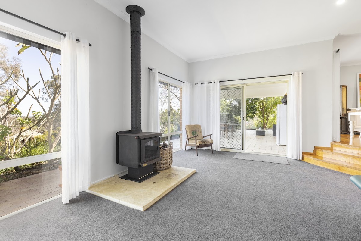 • Living and Dining Areas: The kitchen overlooks the sunken living room, featuring a pot belly fireplace for cozy winter nights and split-system air conditioning for year-round comfort. The dining area, conveniently located adjacent to the kitchen, offers lovely views of the rear gardens.
