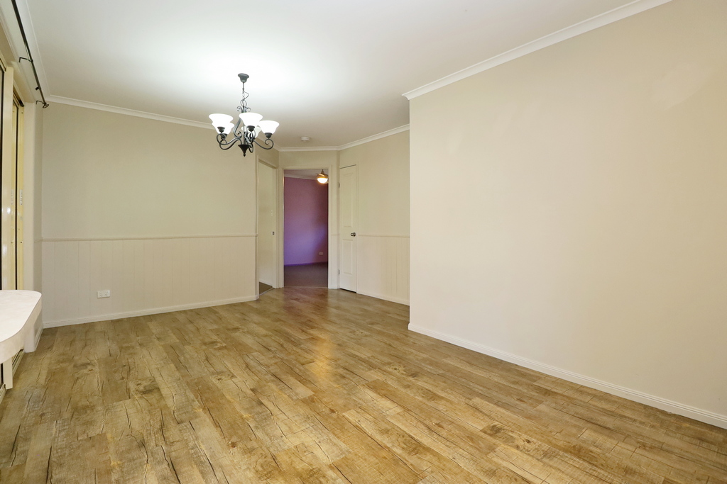 – Timber-look vinyl flooring in living areas; carpeted bedrooms.