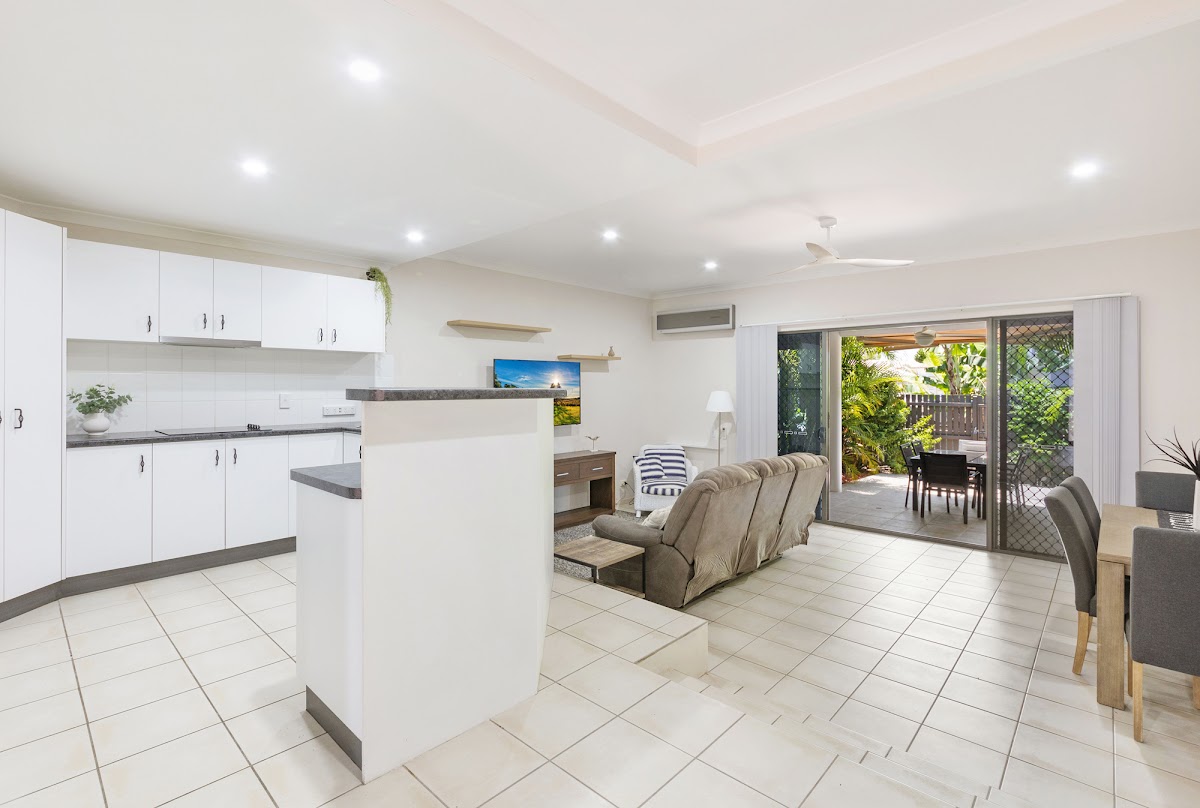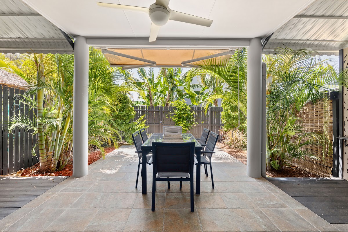 The fully equipped kitchen is a chef’s dream, featuring a built-in dishwasher, ample storage space, and a breakfast bar – making meal preparation a breeze. Enjoy your morning coffee in the courtyard, or dine alfresco in the outdoor entertainment area, surrounded by lush greenery and fresh coastal breezes.