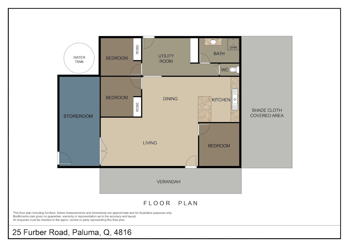 The cabin has 3 bedrooms, a combined living/dining room, large kitchen, separate utility room, a bathroom with separate toilet and a large storeroom and there’s also an attached covered shade cloth area to the side. (See the attached floorplan).
