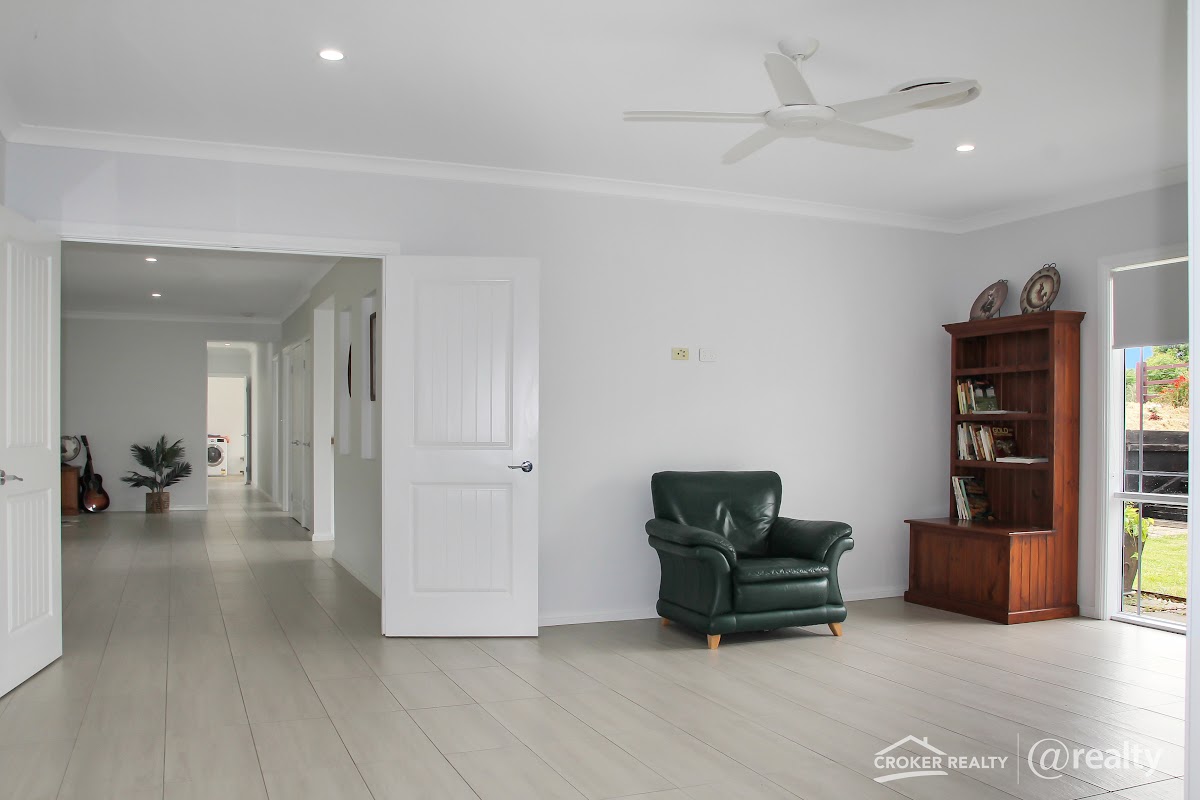 The spacious kitchen is a chef’s dream, featuring a walk-through pantry, gas cook top, electric fan forced oven and dishwasher, making meal prep a breeze. Flowing seamlessly from the kitchen, the dining and lounge areas open through corner sliding glass doors to a large covered outdoor deck, offering breathtaking views of the property, perfect for entertaining or unwinding in the fresh air.