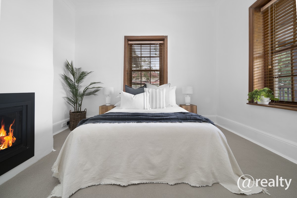 The main bedroom suite flows to both front veranda and to the main bath. This is a great space and has pressed metal ceilings adding another design feature. Two floor to ceiling built in robes are beside the instantaneous gas fireplace.