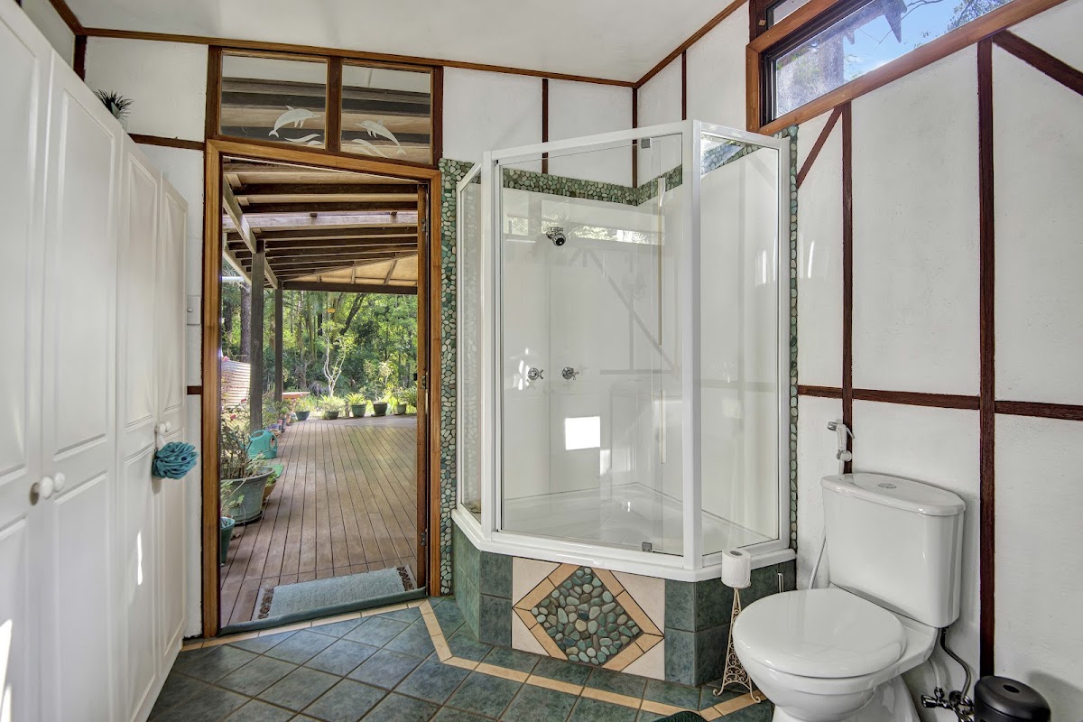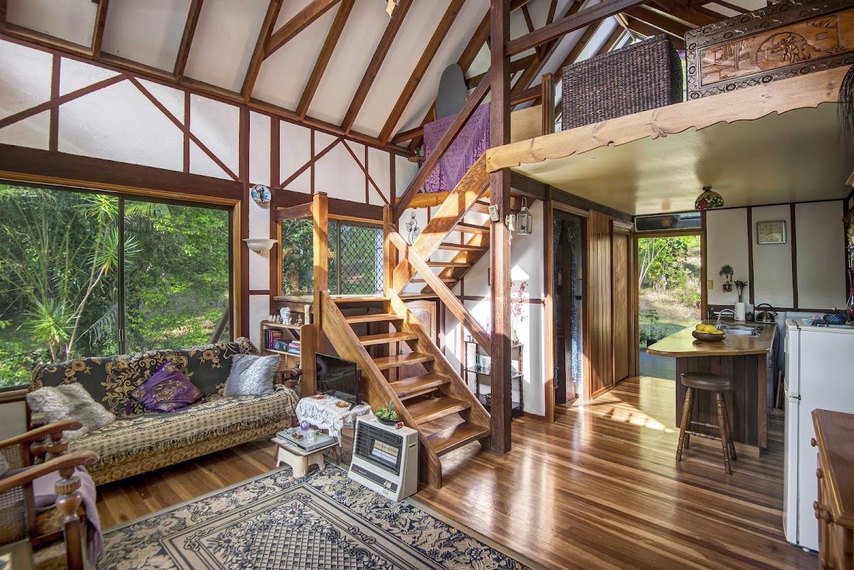 Over the years the home has been meticulously maintained by its original owner. Open plan living is well featured which flows out onto the beautiful deck. Enjoy timber aesthetics throughout, high ceilings, and a leafy un-interrupted outlook in all directions. The home is humble & cosy. The loft style bedroom is light and airy with plenty of windows. Downstairs there is an area that could be used a kids bedroom, or a larger walk in wardrobe. The galley kitchen is basic though very functional with a long timber bench. The home is constructed of hardwood timbers & a sawcrete combination for the cladding/infill (sand, sawdust, cement) which is a great insulator. There is ample deck space to enjoy your cups of coffee + the serenity.