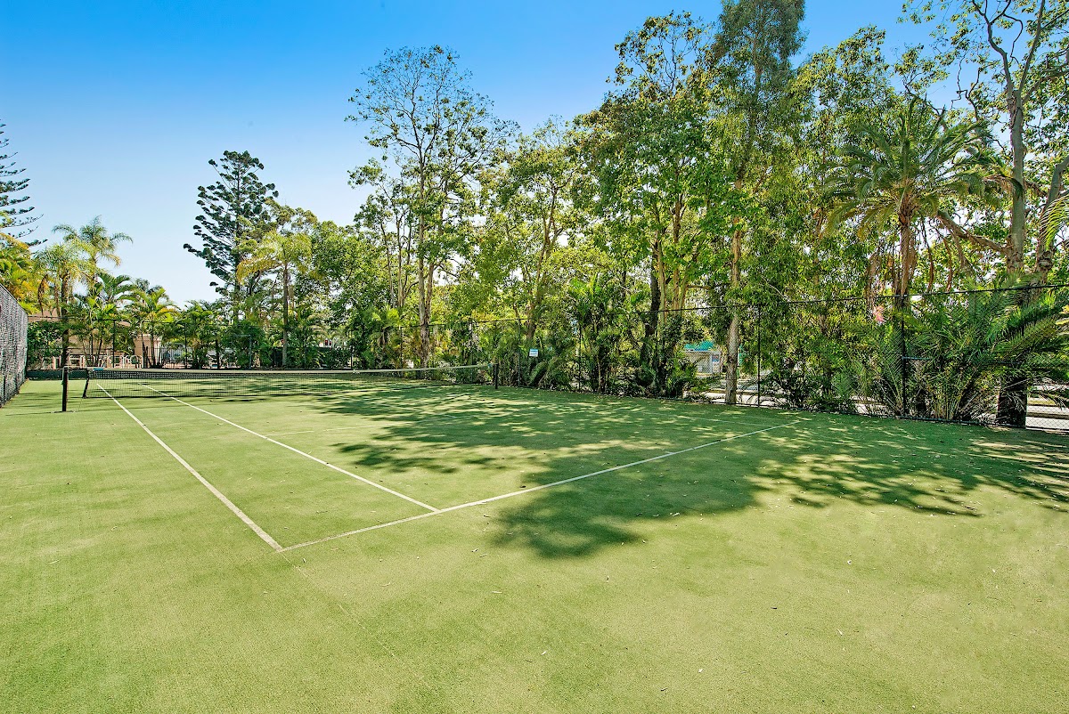 The modern kitchen features stone benchtops and loads of storage and has Narang river views. The kitchen leads out to the tiled open plan living and dining area with views of Broadbeach, Nerang River and the Hinterland.