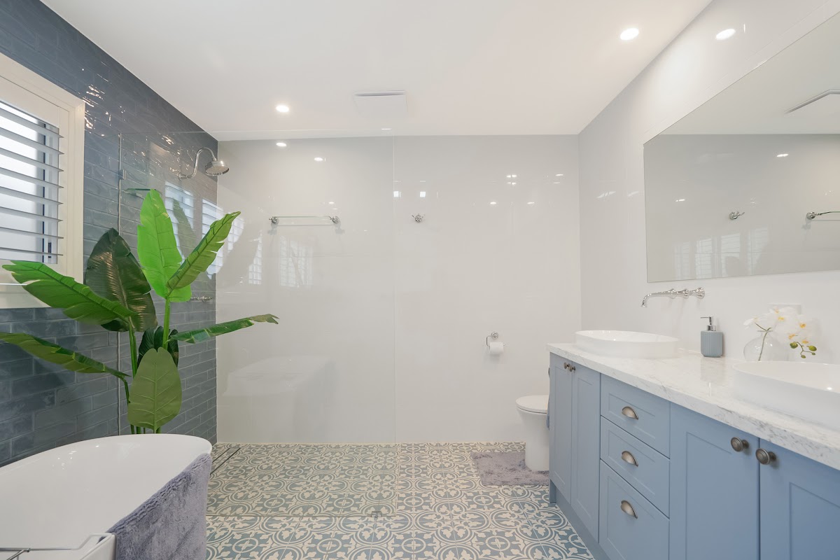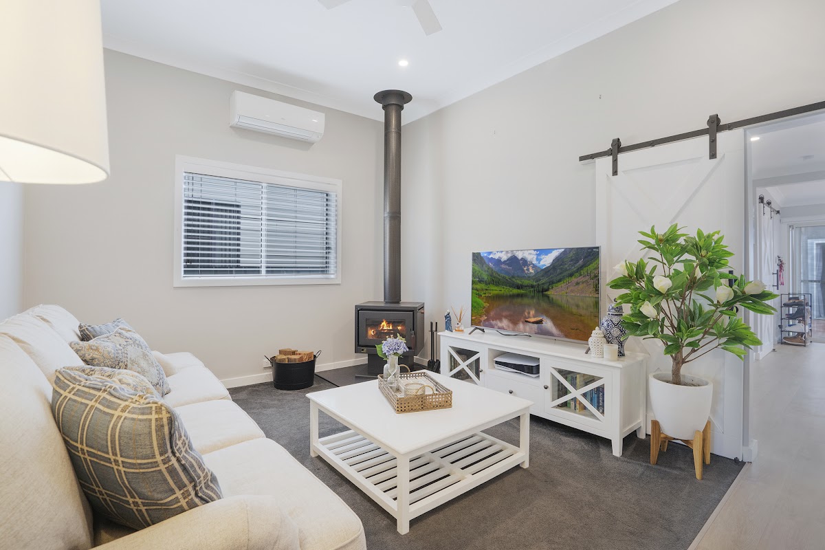 The coastal inspired kitchen design features a large L-shaped island bench, the perfect space for entertaining family and friends. The luxurious main bathroom offers double sinks, a free-standing bath, a separate walk-in shower, and stunning feature tiles. A second bathroom adds convenience and functionality for family and guests.. The cozy fireplace enhances the warm, inviting living space, making it the perfect spot to unwind.