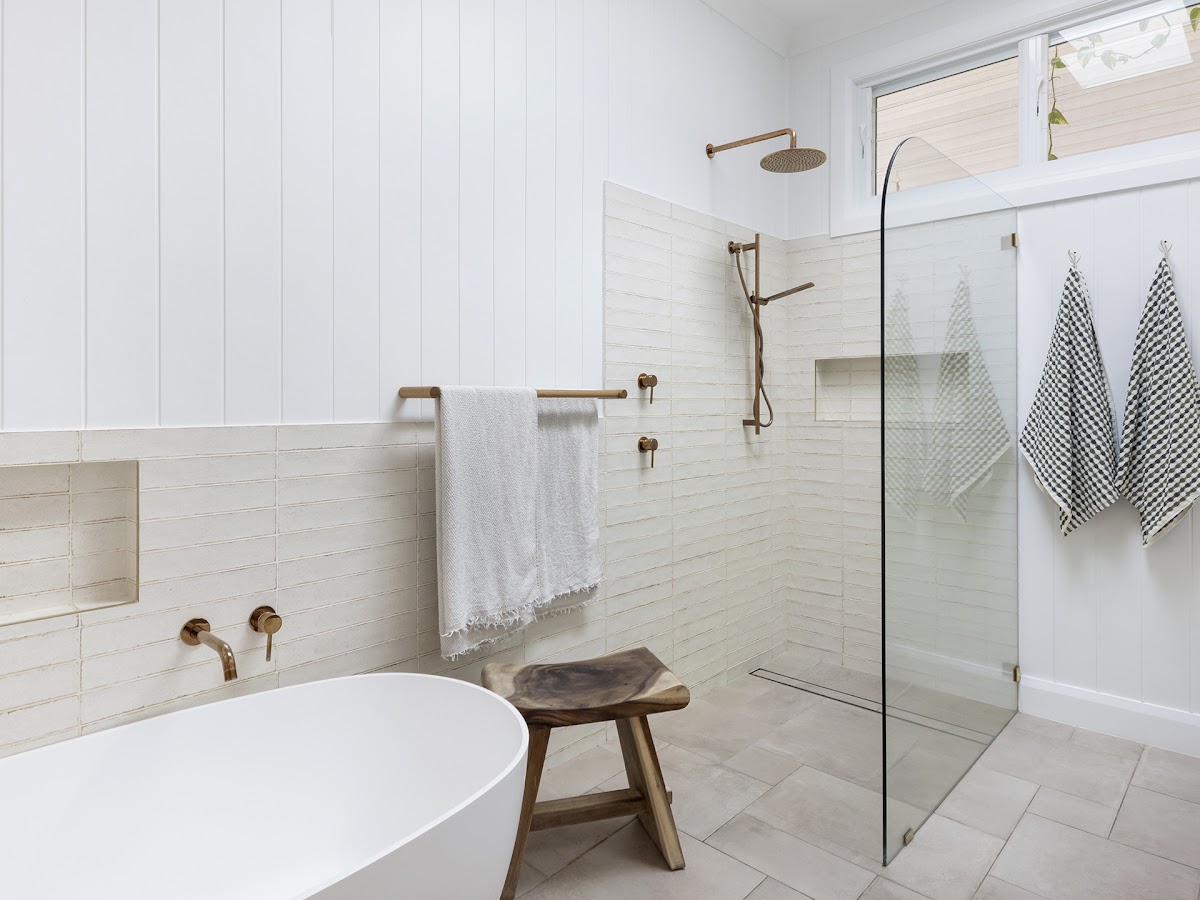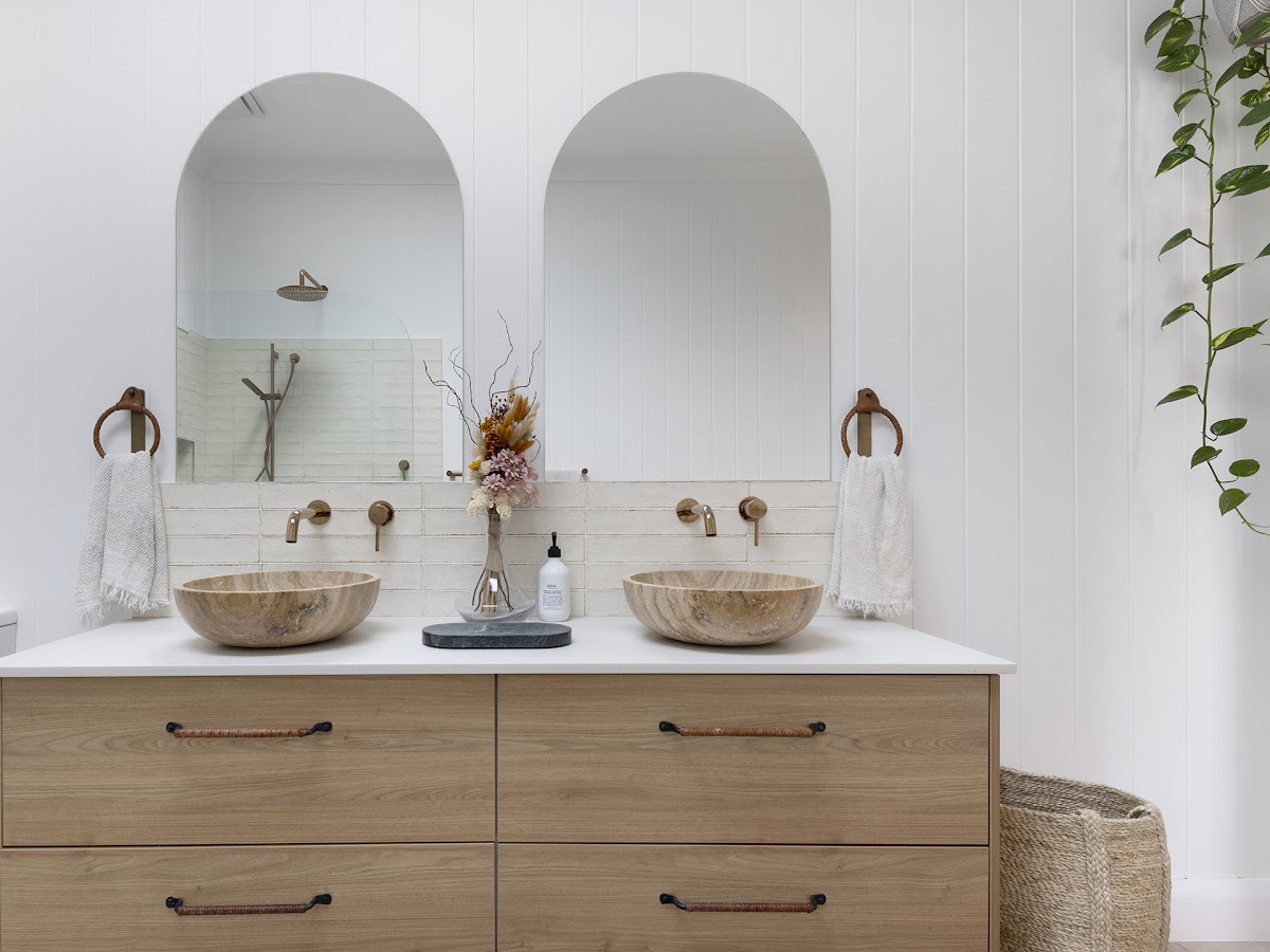 • Designer Bathroom: French lay tiles underfoot, rose gold tapware, society inc hardware, designer wall tiles, shower niche, twin travertine stone basins, spacious shower, freestanding oval bath, and heat lamp overhead.