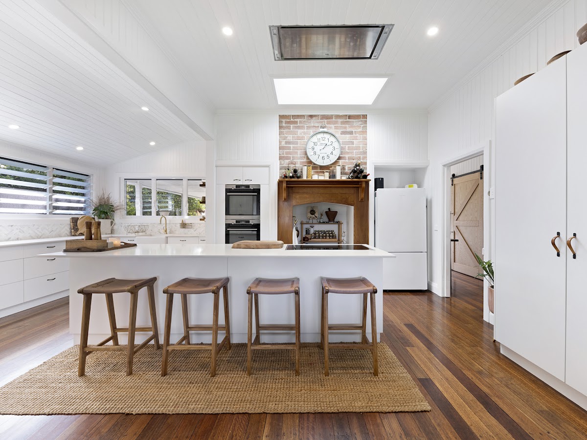 • Light-filled kitchen adjoining the dining area. Literally designed for catering. Extensive island breakfast bar with stone benchtops, gold tapware, dual ovens, hide-away dishwasher, a plethora of drawers and bench space, fishbone tiled splashback, fireclay farmhouse sink, electric cooktop and accent mosaic tiles. Louvre windows ensure cross flow, whilst the skylight, star & sunlight.