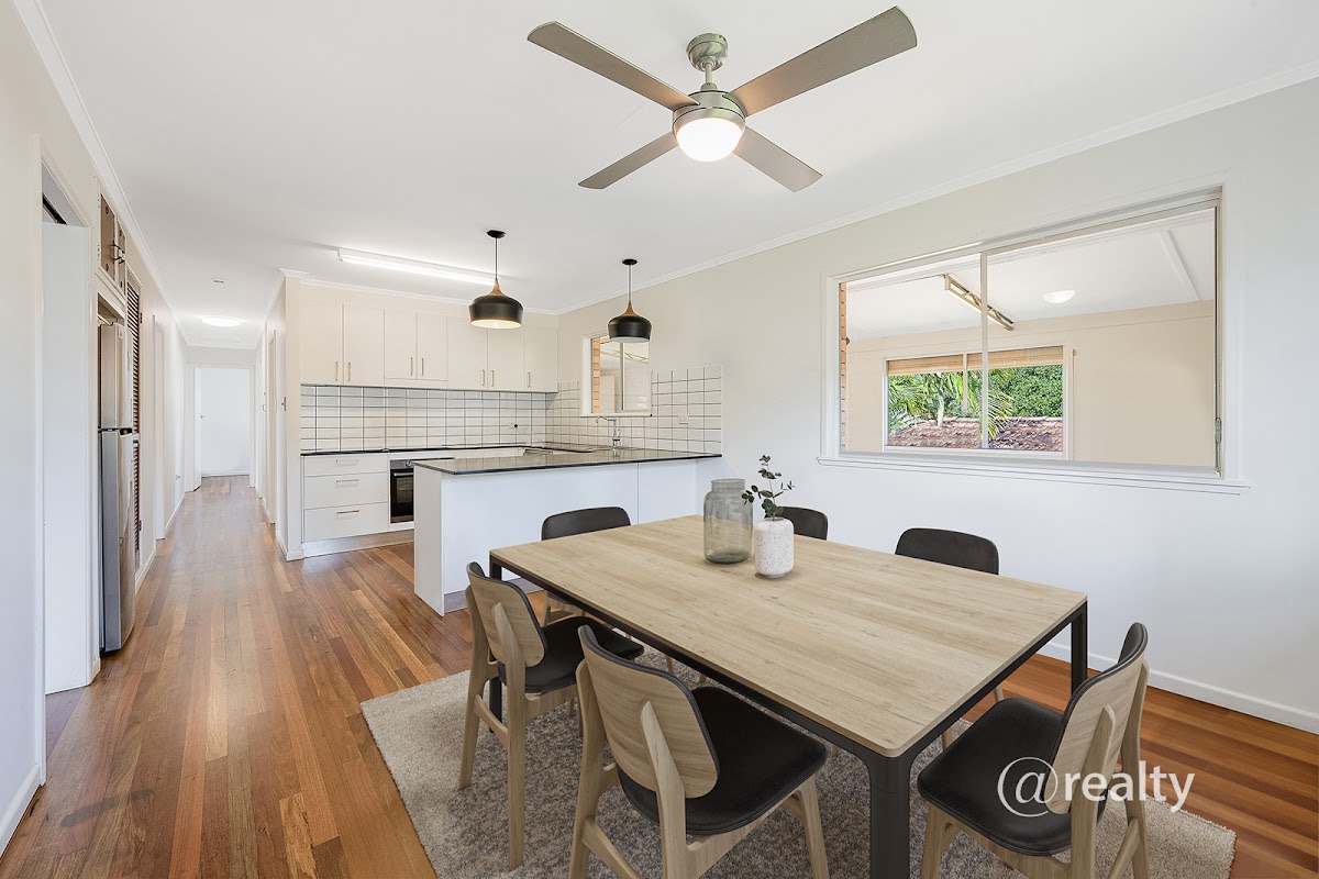 The kitchen boasts modern appliances, ample storage space, and a large breakfast bar, and with adjoining dining makes for a very comfortable space to cook and connect with the family.