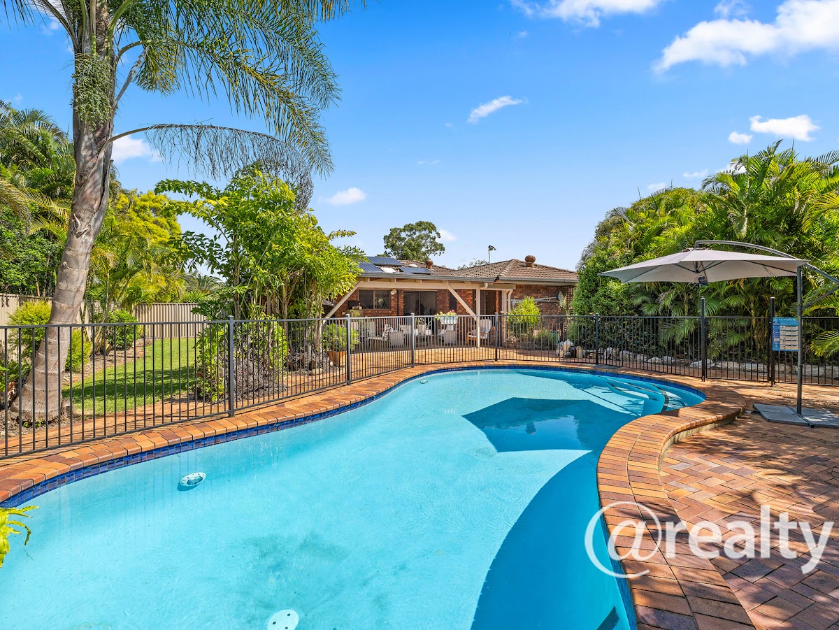 The living area opens to an outdoor entertainment area and a tropical garden oasis, where the melody of birds complements the sparkle of the inviting in-ground pool.