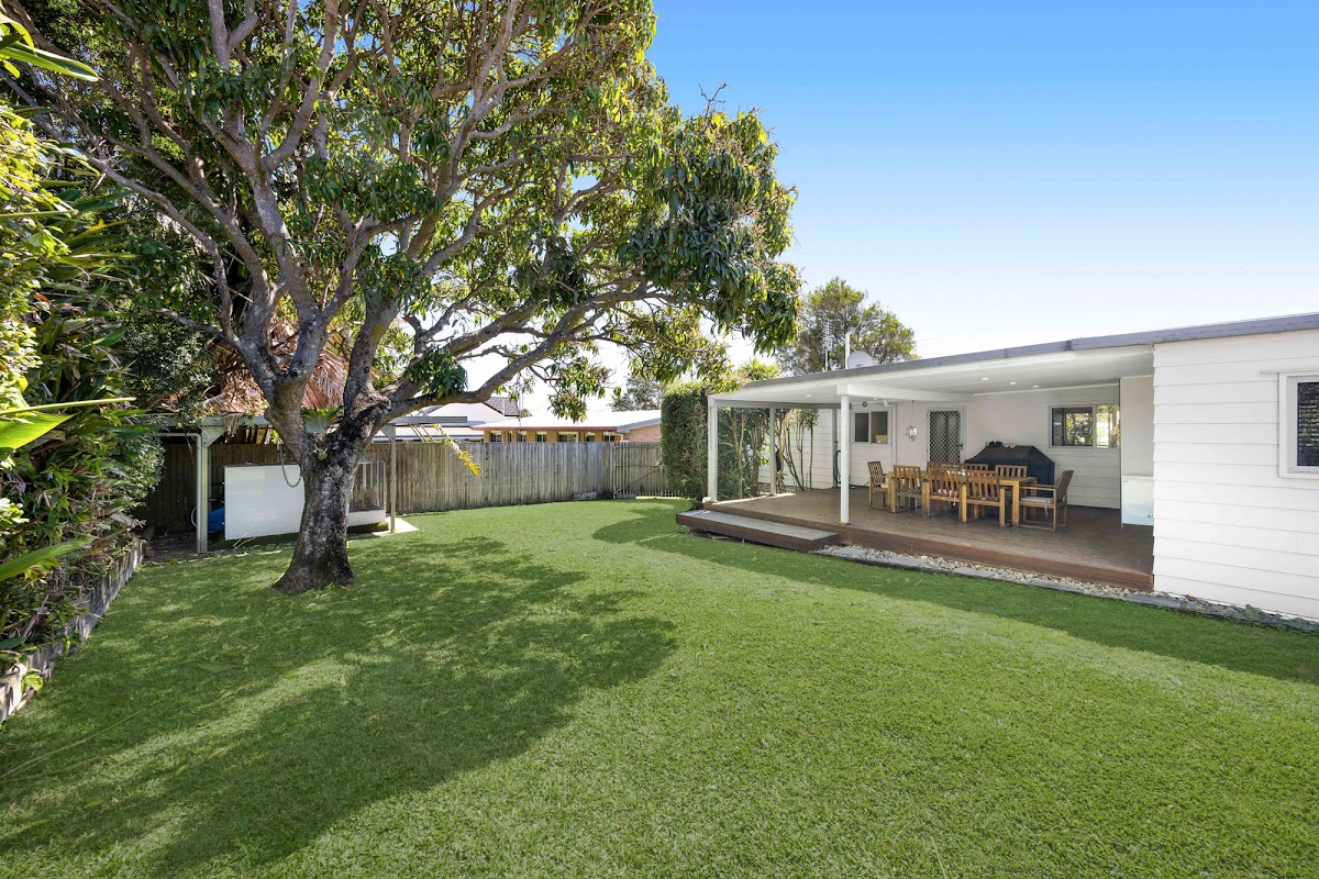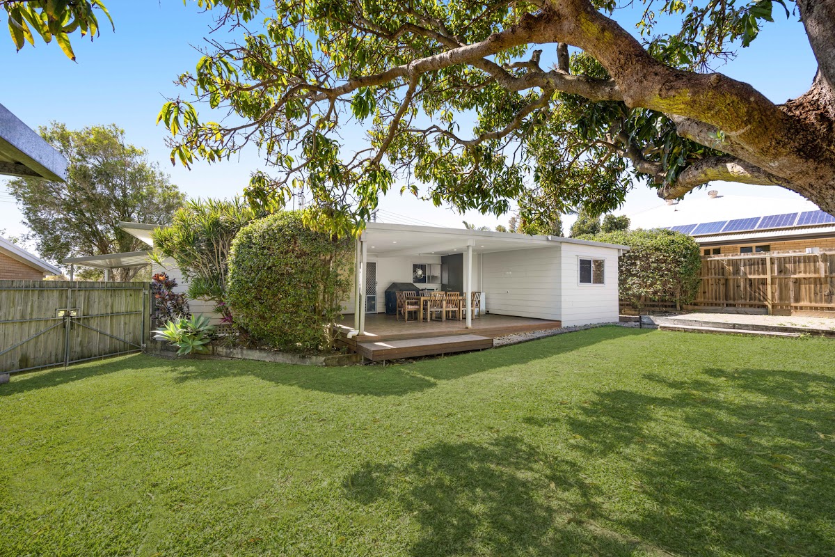 Outside, the large covered timber deck is perfect for casual entertaining or simply enjoying the outdoors. It overlooks a spacious, level backyard where an established mango tree provides natural shade. The low-maintenance garden is complemented by a garden shed and side access to the block, offering extra convenience.