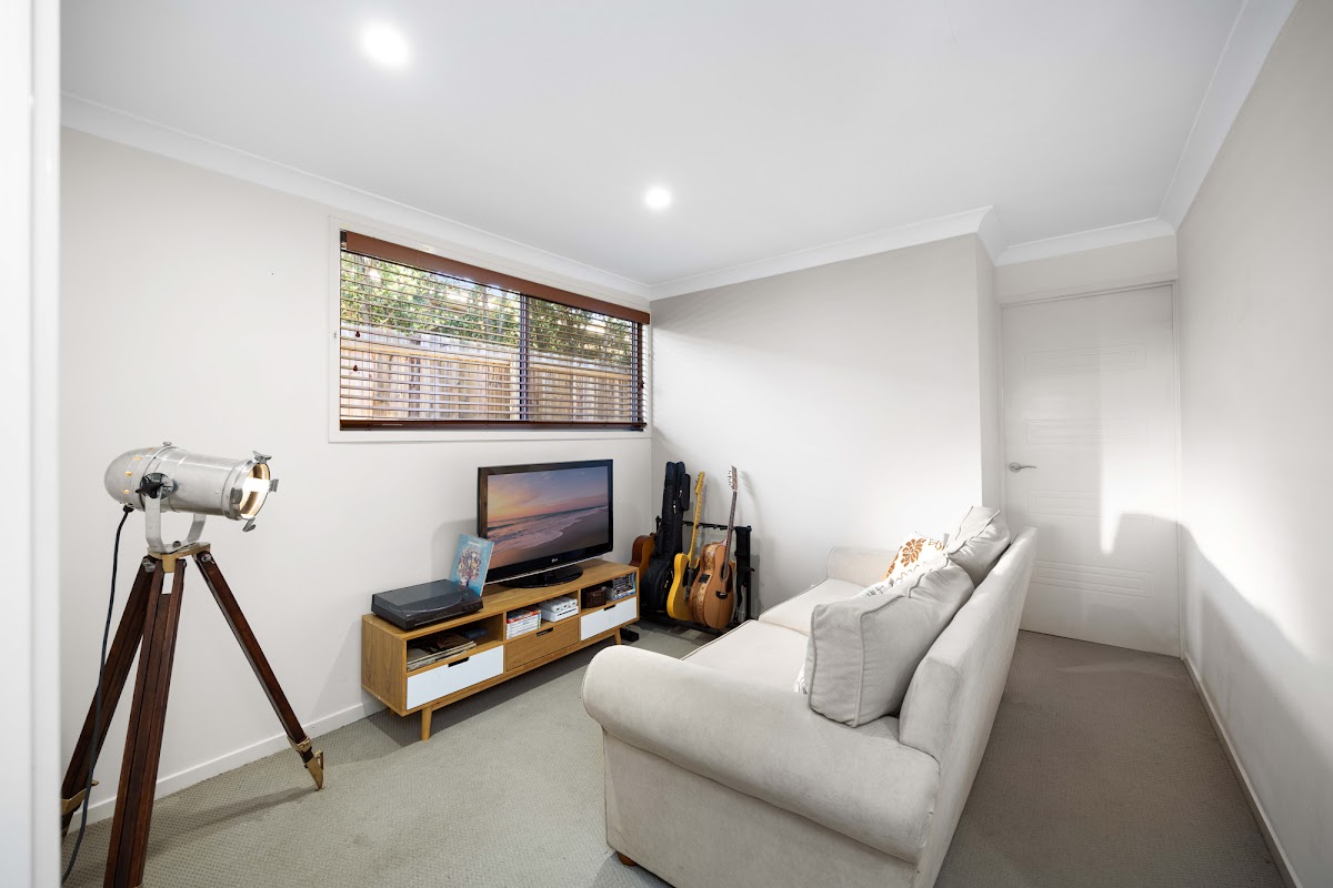 Off the main living space, a separate media room provides a cosy spot for movie nights or quiet relaxation, while the adjacent laundry adds a practical touch to the home’s layout.