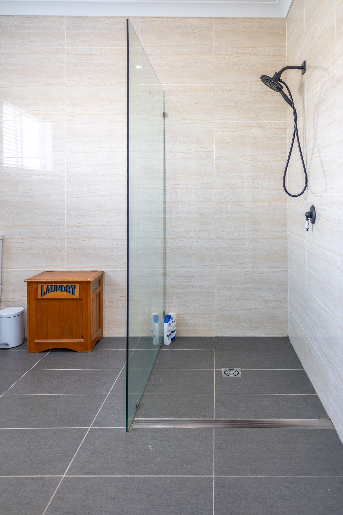The master suite is incredible – extremely oversized and finished to perfection, with walk-in robes, a luxury ensuite featuring double rainfall showers and full-height tiles, plus a bonus nursery, office, or sunroom space. Double doors open directly onto the deck.