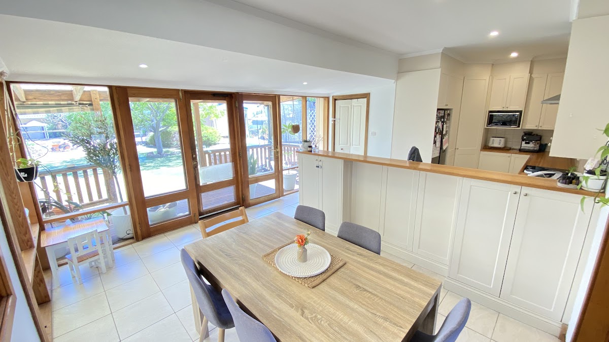 Designed for relaxed family living, the heart of the home features an open-plan kitchen and dining area with French doors opening directly onto the undercover deck and entertaining area—perfect for indoor/outdoor living.