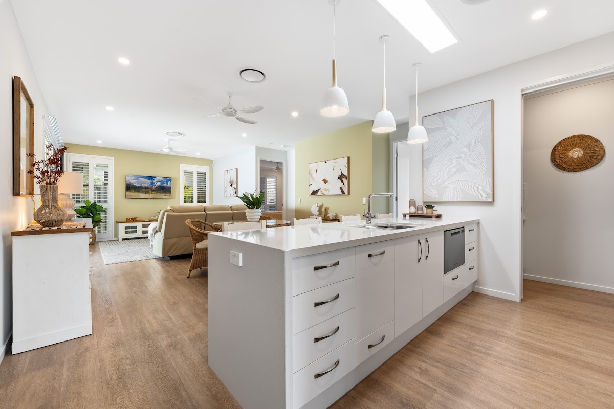 The stylish chef’s kitchen forms the heart of the home and is designed for both functionality and elegance. It features 40mm stone benchtops with a waterfall edge, white gloss laminate cabinetry, pendant and LED strip lighting, and quality Smeg appliances including an induction cooktop, electric wall oven, built-in convection microwave, and dishwasher drawer. A spacious walk-in pantry with adjustable shelving and drawers adds practicality, while all drawers and cupboards in both the kitchen and bathrooms are fitted with soft-close mechanisms for a premium finish.