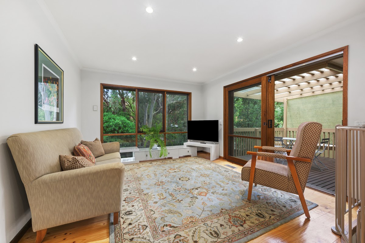 The kitchen features stone benches, stainless steel appliances, a five-burner gas cooktop, and a dishwasher. The open-plan meals and family rooms open to the deck offer leafy views. There is also a separate lounge, study, and laundry.