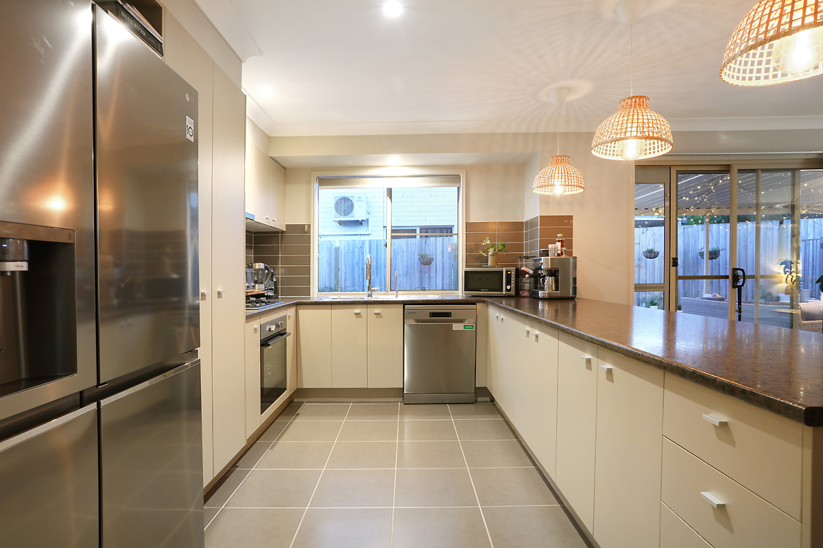 The heart of the home – a chic sophisticated kitchen with a breakfast bar, plenty of cabinetry and a plumbed fridge perfect for entertaining friends or family