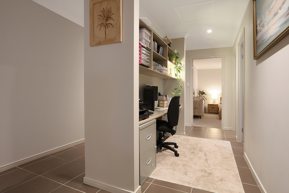 A well proportioned study nook featuring a long built in bench and practical overhead shelving – a smart stylish space for work or creativity