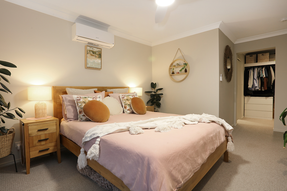 Master bedroom with a double vanity ensuite and walk in robe situated at one end of the home